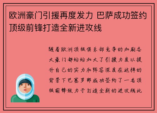 随着欧洲顶级俱乐部竞争的加剧,各大豪门都...