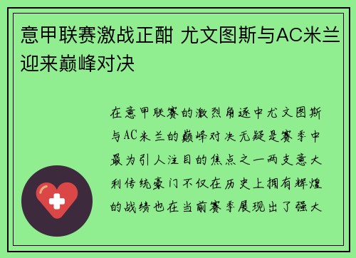 在意甲联赛的激烈角逐中,尤文图斯与AC米...