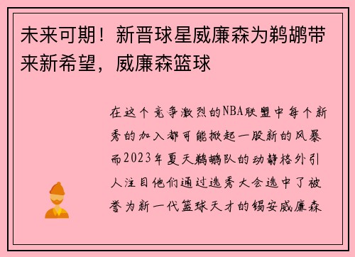 在这个竞争激烈的NBA联盟中,每个新秀的...