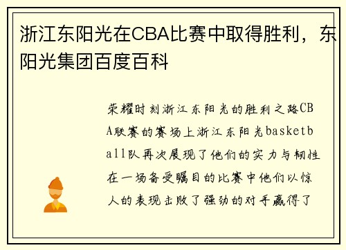 荣耀时刻:浙江东阳光的胜利之路 CBA联...