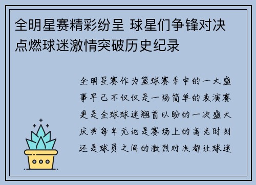 全明星赛作为全球体育赛事中的一大亮点,每...