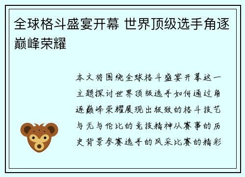 本文将围绕全球格斗盛宴开幕这一主题,探讨...